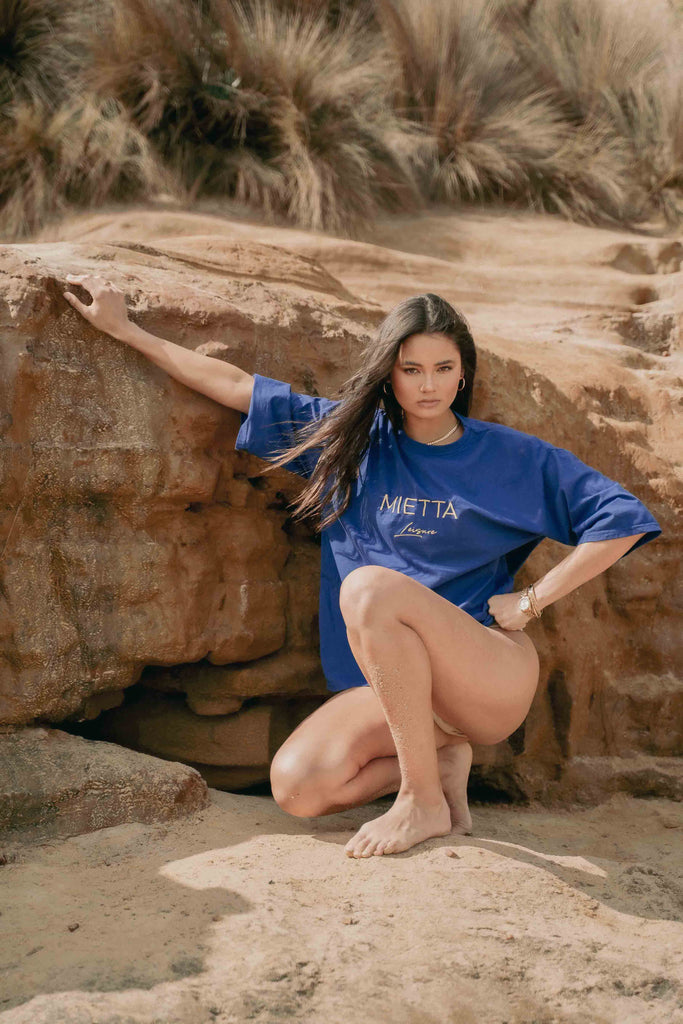 The Royal Blue over sized t shirt. Great to be worn in many ways. This colour looks fabulous matched with a pair of black shorts and sneakers.